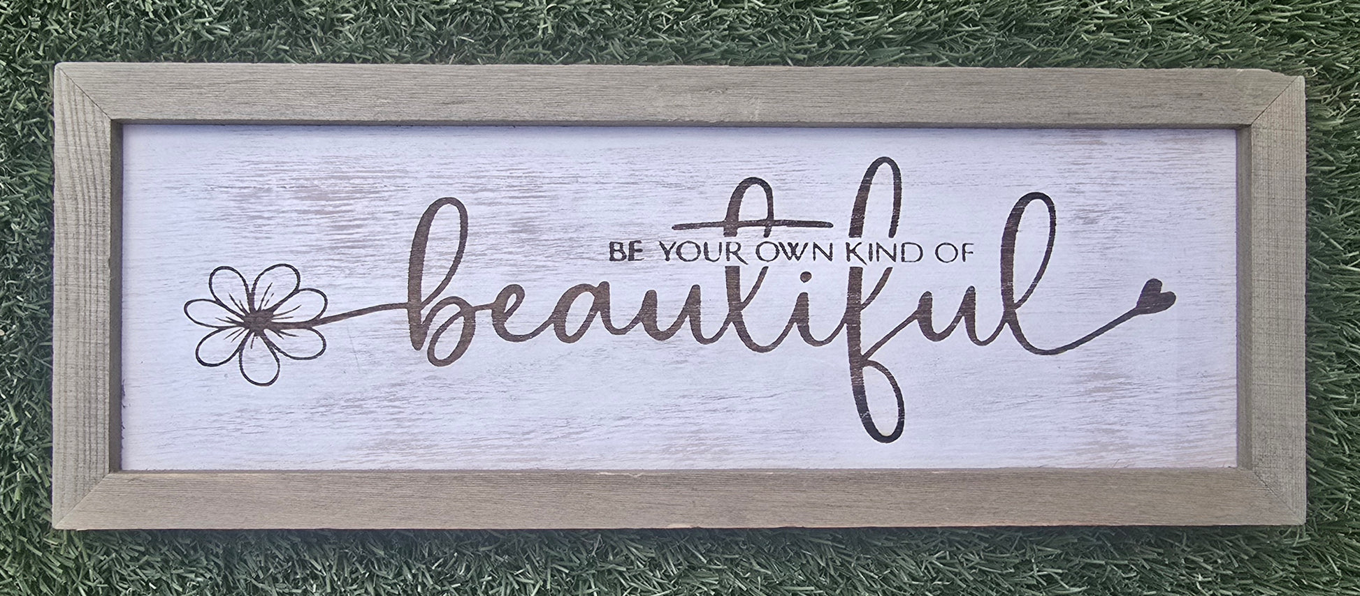 5.5" x 15" x 1" Whitewashed Framed Sign with Custom Laser Engraved Design.